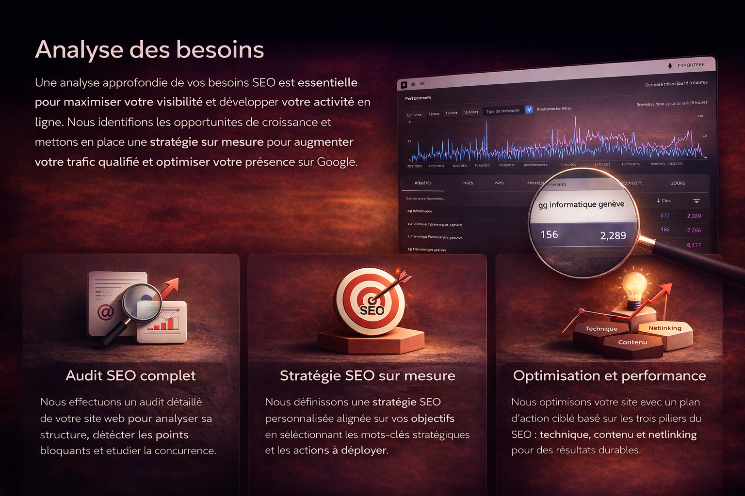 Chez Website Genève, nous mettons en place une stratégie SEO complète, technique et mesurable, conçue pour positionner durablement votre site en tête des résultats sur Google et les autres moteurs de recherche.