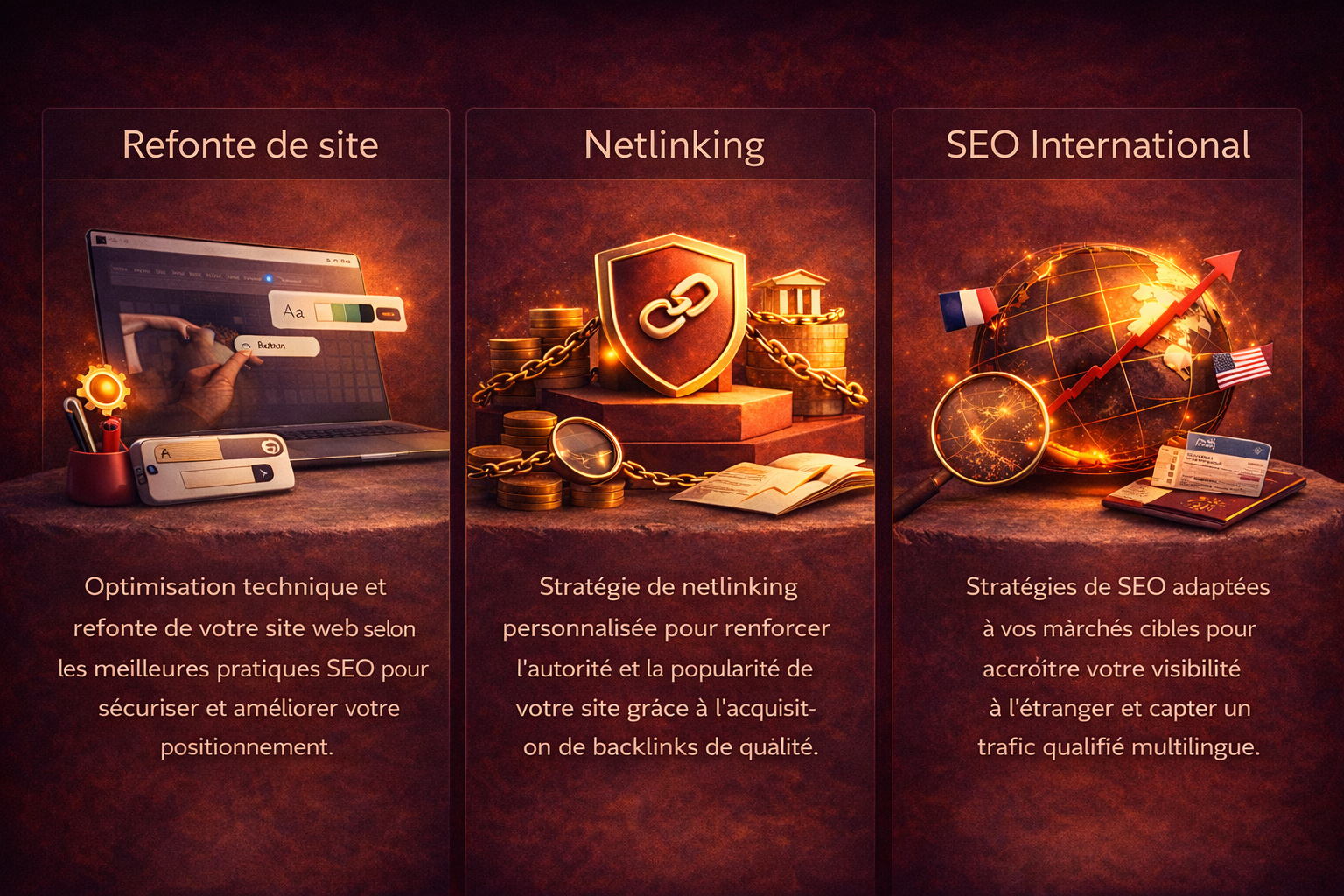 Nos consultants définissent et déploient des stratégies de SEO international adaptées à vos marchés cibles afin d’augmenter votre visibilité à l’étranger. Nous optimisons votre site pour capter un trafic qualifié multilingue et maximiser votre croissance digitale à l’échelle internationale.